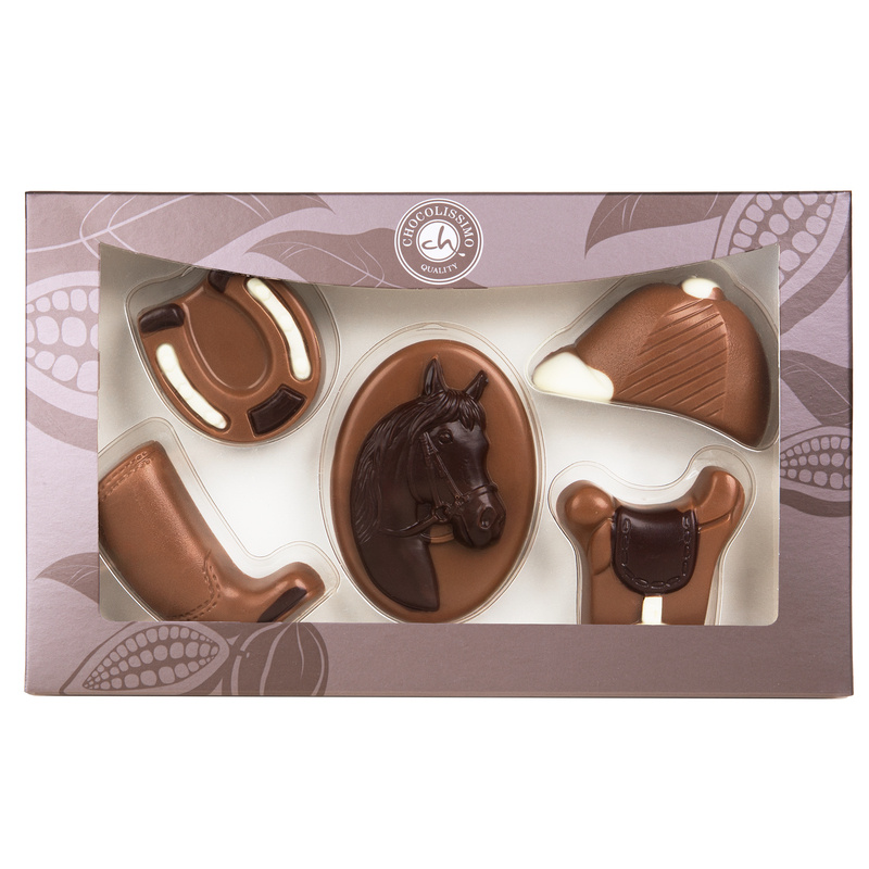 Un set unic de ciocolata creata special pentru cei care iubesc echitatia. Figurile de ciocolata pot fi folosite, de asemenea, pentru a decora torturi si prajituri.