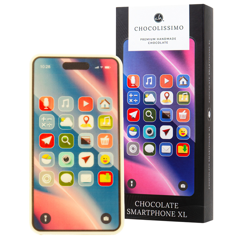 Smartphone-ul din ciocolată este un cadou original și surprinzător, care îmbină lumea tehnologiei moderne cu măiestria ciocolatieră de cel mai înalt nivel. Acest smartphone de ciocolată este creat manual în atelierul Chocolissimo, sub supravegherea unor ciocolatieri experimentați, exclusiv din ciocolată belgiană albă de calitate superioară. Fiecare exemplar este realizat chiar înainte de expediere, ceea ce garantează o prospețime maximă și un gust excelent.