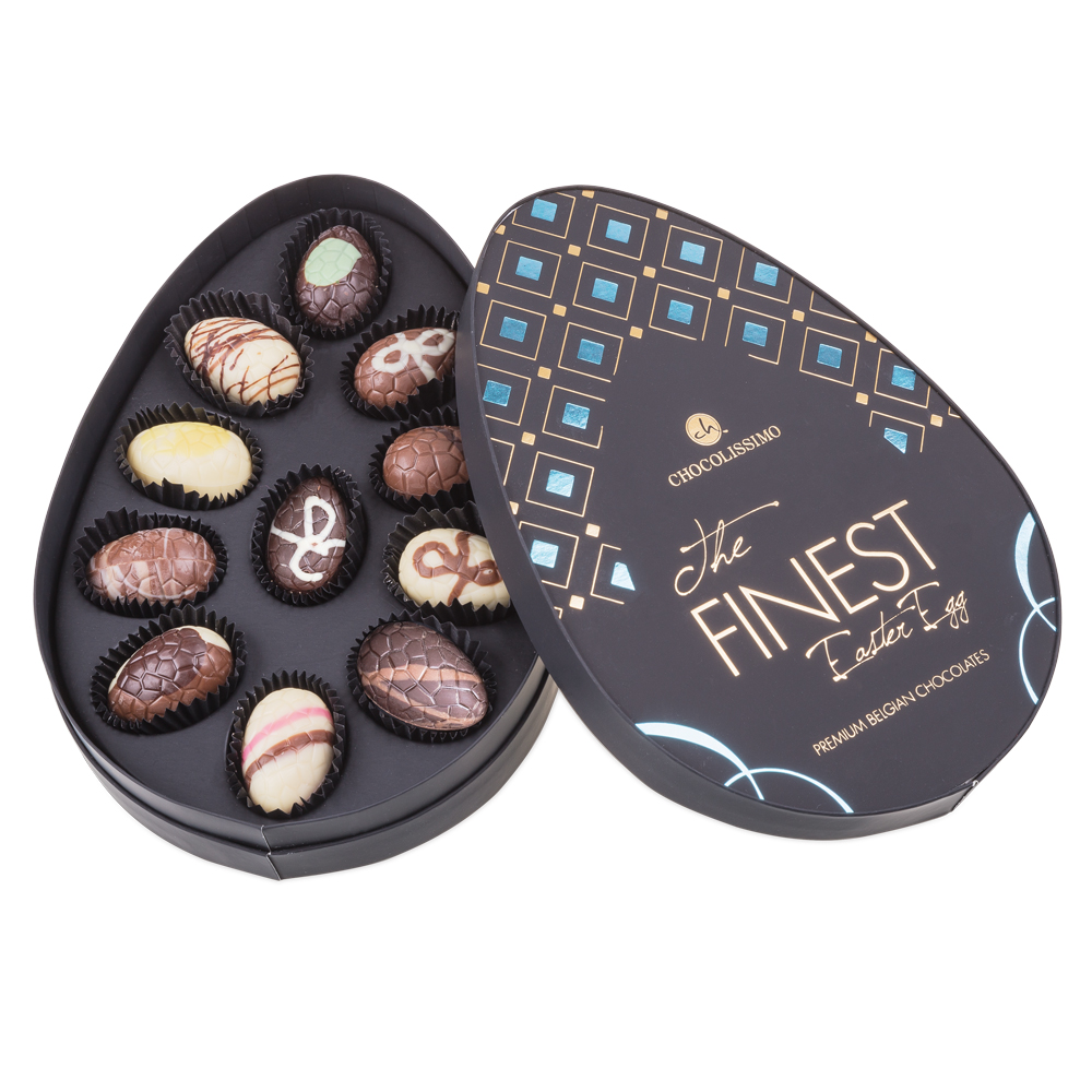 Intr-o cutie extrem de eleganta, embrosata cu romburi de culoare albastra, am adaugat 11 praline premium din ciocolata belgiana delicata, in forma de oua de Paste, umplute cu creme surprinzatoare si decorate manual. Un deliciu pentru iubitorii de ciocolata.