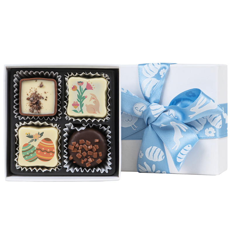 Cele 4 praline premium din cea mai fina ciocolata belgiana, doua praline standard, doua praline printate cu tematica de Paste, cu umpluturi inedite, decorate manual, , sunt ambalate intr-o cutie alba, eleganta, pe care am adaugat o fundita cu tematica pe Paste.