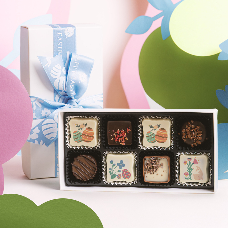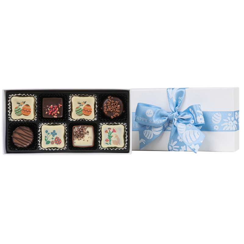 Cele 8 praline premium din cea mai fina ciocolata belgiana, patru praline standard si patru praline printate cu tematica de Paste, cu umpluturi inedite, decorate manual, , sunt ambalate intr-o cutie alba, eleganta, pe care am adaugat o fundita cu tematica pe Paste.
