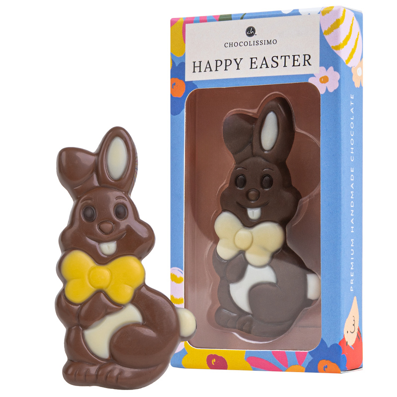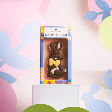 Dragalasul iepuras din ciocolata belgiana cu lapte este decorat cu ciocolata alba si ambalat intr- o cutie simpatica cu fereastra si abia asteapta sa fie descoperit si savurat.