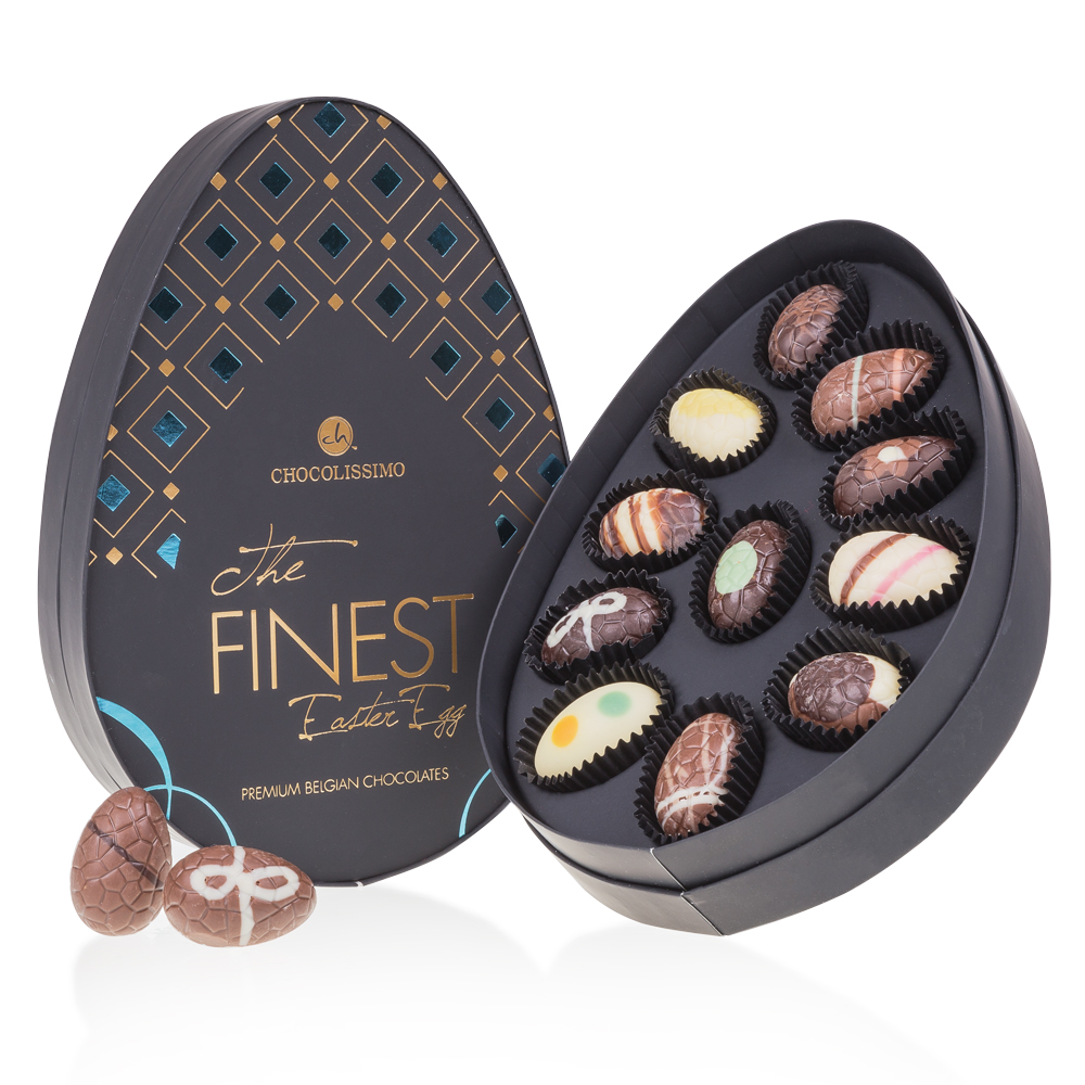 Intr-o cutie extrem de eleganta, embrosata cu romburi de culoare albastra, am adaugat 11 praline premium din ciocolata belgiana delicata, in forma de oua de Paste, umplute cu creme surprinzatoare si decorate manual. Un deliciu pentru iubitorii de ciocolata.
