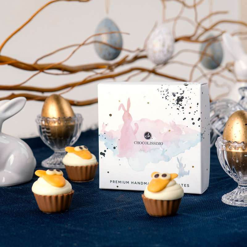 Intr-o cutie eleganta, cu tematica de Paste, am adaugat 4 praline premium din cea mai fina ciocolata belgiana, in forma de oite, cu umplutura delicioasa.