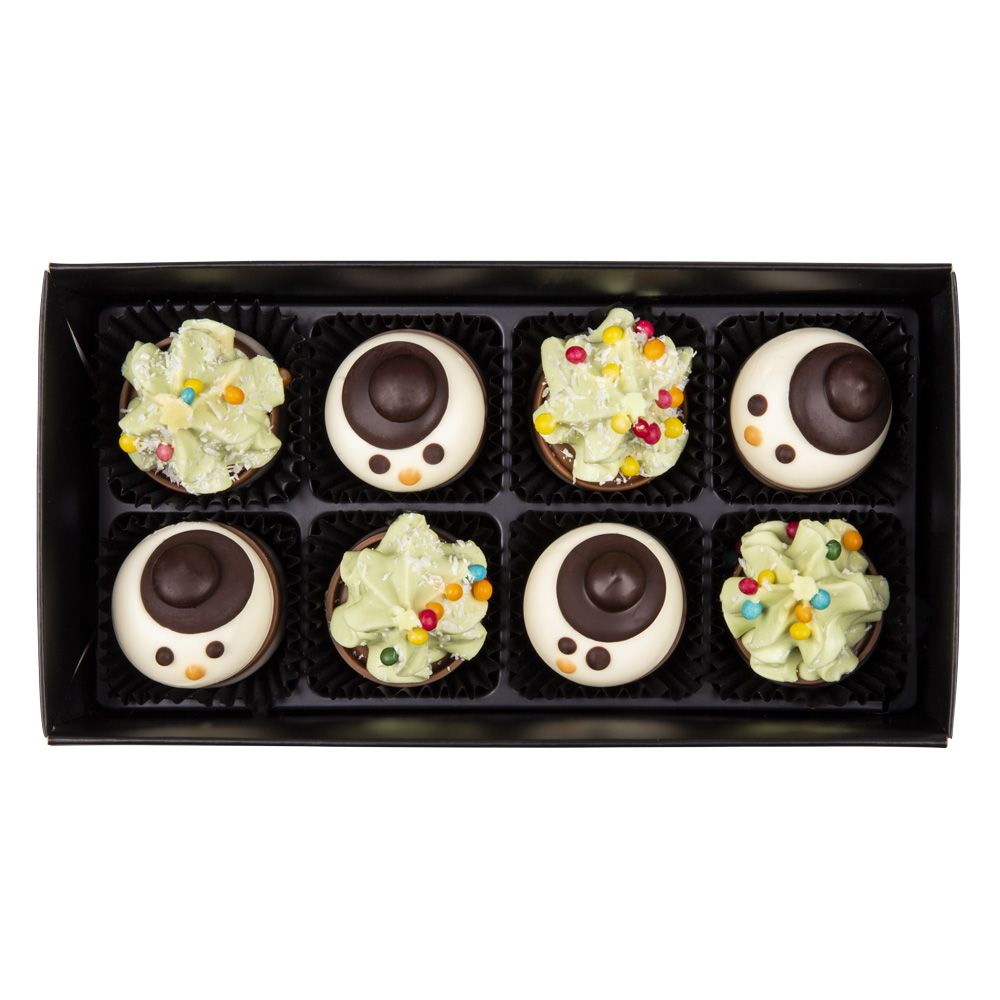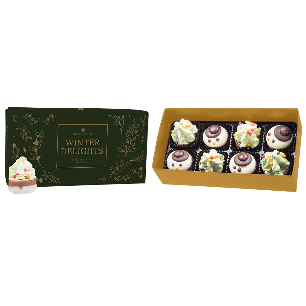 Cele 8 praline premium delicioase din ciocolata belgiana, patru in forma de braduti impodobiti si patru in froma de oameni de zapada, au fost adaugate intr-o cutie eleganta, negru cu auriu, cu motive specifice sezonului.